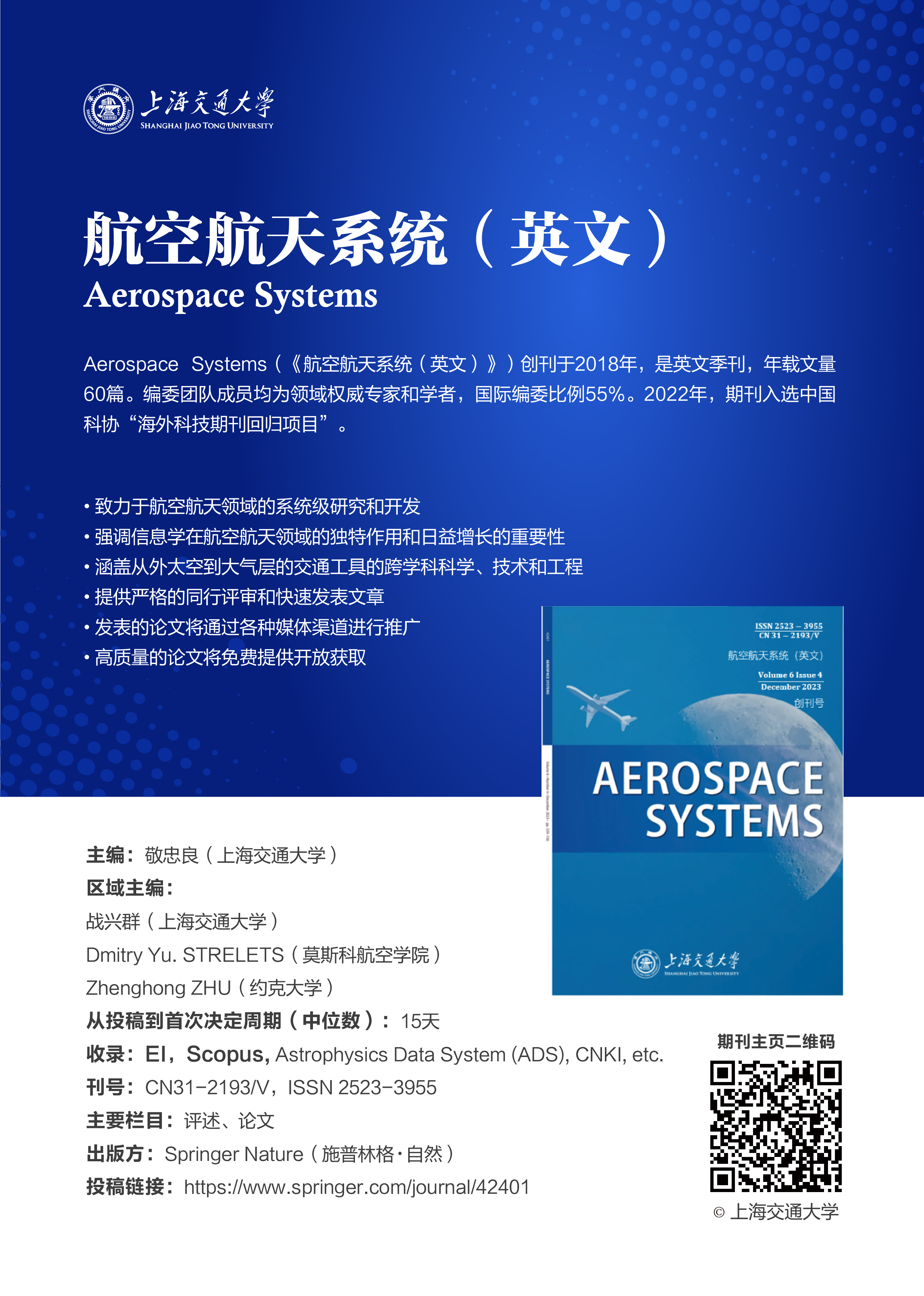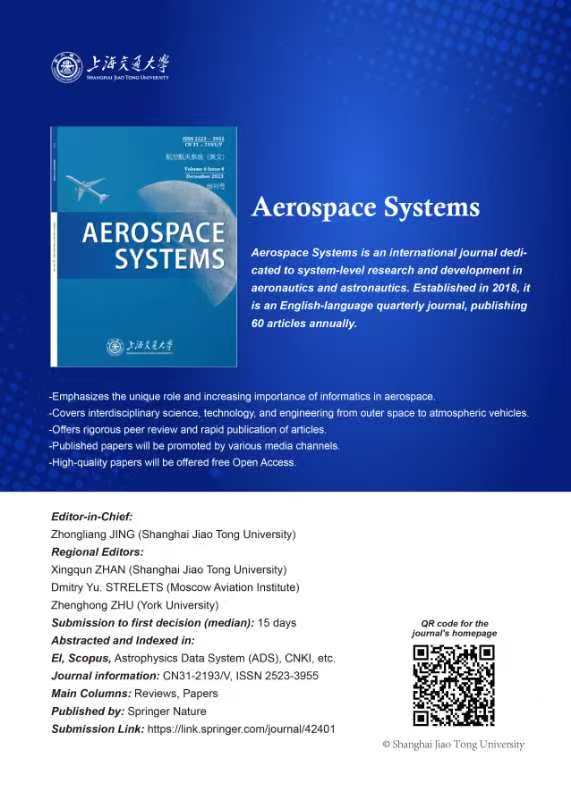Aerospace Systems(《航空航天系统(英文)》)由球盟会qmh网站qmh球盟会亚博主办,是专注于航空航天系统级研究与开发的英文国际学术期刊。球盟会qmh网站长江特聘教授敬忠良担任主编,球盟会qmh网站长聘教授战兴群、莫斯科航空学院教授Dmitry Yu. Strelets、加拿大工程院院士Zhenghong Zhu分别担任亚太、欧洲、美洲区域主编。期刊与国际知名出版商Springer Nature(施普林格·自然)合作,全球出版发行。
