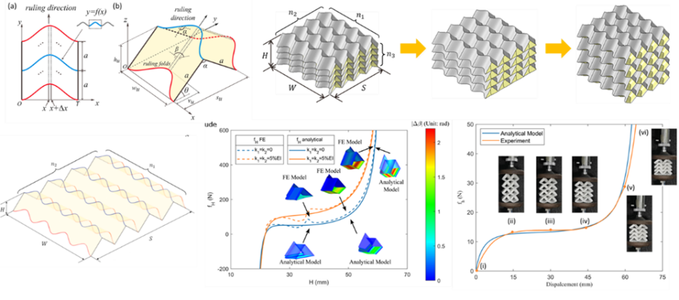 在先进航空材料与结构方向上,课题组近年来开展了纳米点阵夹层复合材料结构1、先进折纸材料和结构2等方面的研究。提出了纳米点阵夹层复合材料结构承载-热控多功能一体化技术,充分发挥纳米增强空心金属微点阵材料的高孔隙率、高比强度、高比表面积、高热传导等优点,以及相变材料和复合材料的各自性能优势,实现结构的多功能化。结合多尺度试验和模拟技术,揭示了纳米增强机理和热控机理,解决了微小卫星热控需求与其空间限制和轻量化设计要求之间的矛盾,有效降低整星重量以及星载器件温度波动。在先进折纸材料和结构方面,开展了折纸结构的基础设计理论、折叠芯材夹层结构、折纸力学超材料、曲线折纸结构、复合材料吸能管、折纸机器人等方向的研究工作。