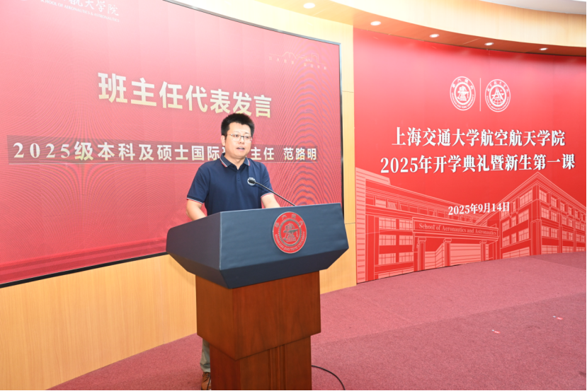 范路明作为新生班主任代表发言。他以“选择”和“成长”两个关键词分享了自己的感悟,为同学们选择航空航天专业“点赞”,希望同学们“放下过往的成绩与光环,以归零的心态重新出发”。