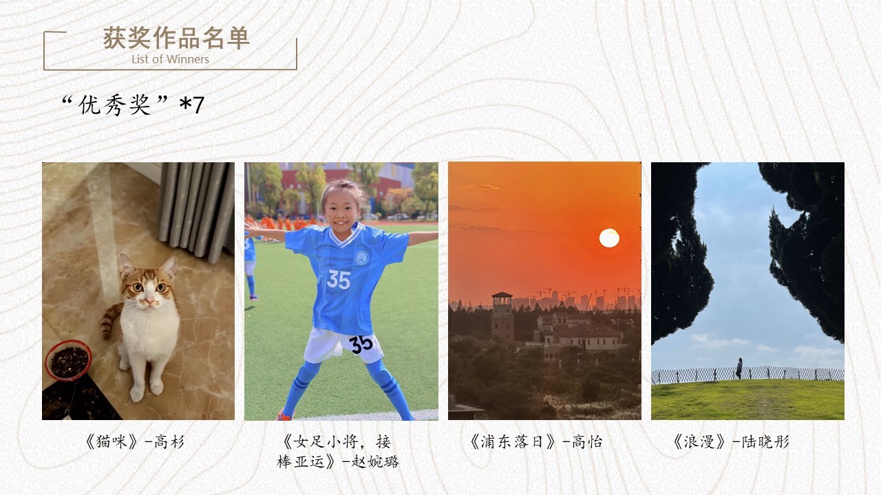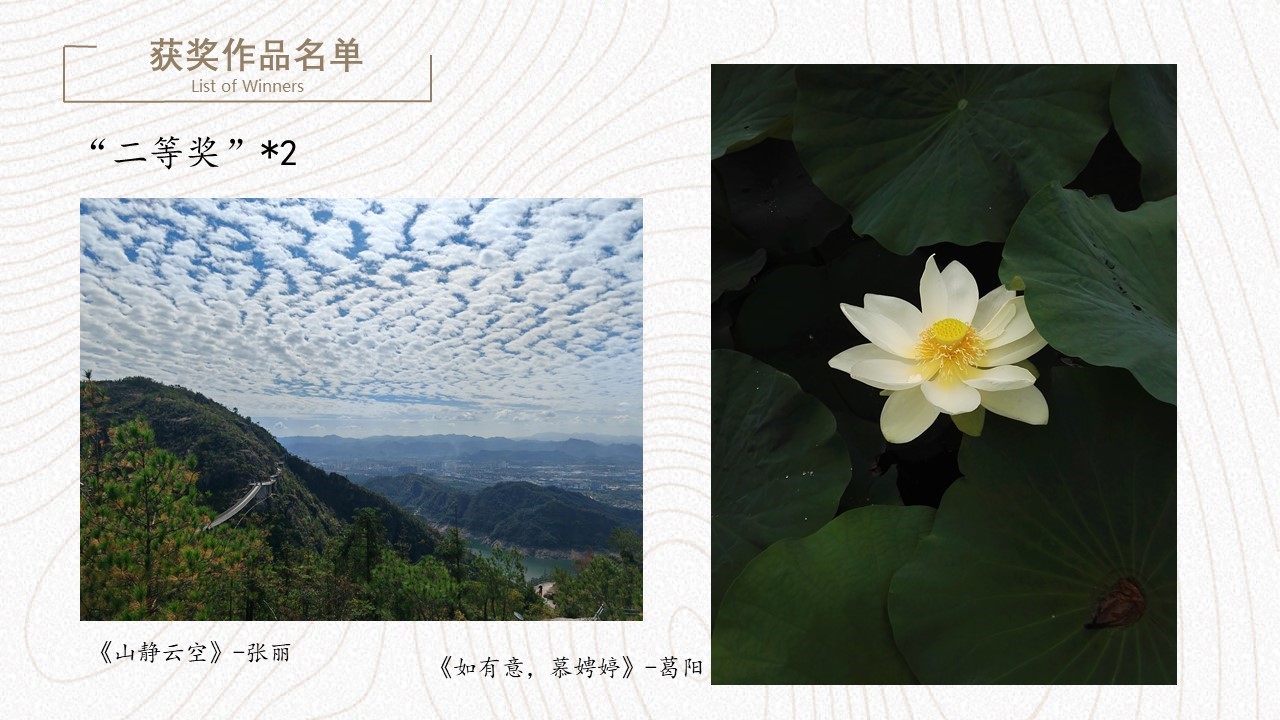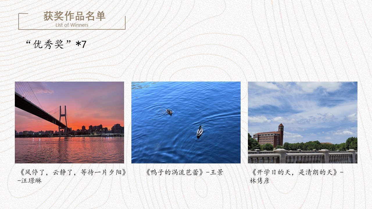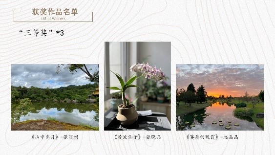 活动共征集到摄影作品40余份,内容涵盖美丽校园、雄伟建筑、山川自然、家庭和宠物等,以丰富的艺术语言表现出拍摄者独特创意和才华。活动邀请到三位专业审员从构图、色调、意境三个方面进行评审打分,最终评出最佳作品奖1名、一等奖1名、二等奖2名、三等奖3名、优秀奖7名。